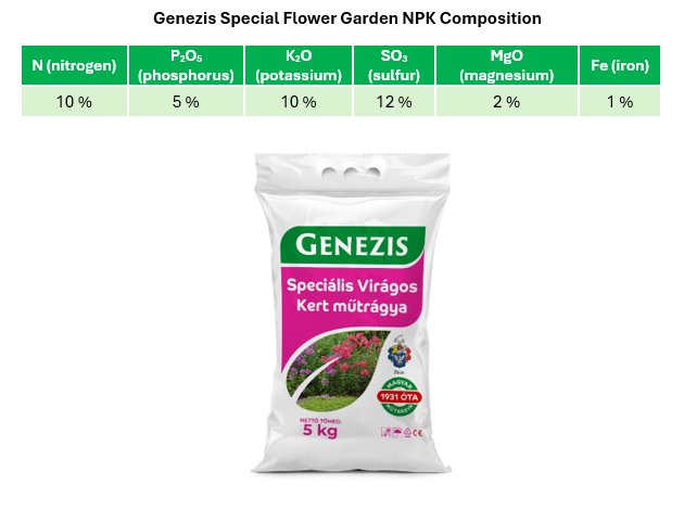 These symptoms can be easily avoided by using a reliable, high-quality product, such as Genezis Special Flower Garden NPK. This product contains all three macronutrients in proportions specifically tailored to the needs of flowers, and it also has a high sulfur content, which further enhances the absorption and utilization of the nutrients taken up. Roses also require magnesium and iron separately. Among other things, for the development of beautiful, green, and healthy foliage, since both elements play a role in the formation of chlorophyll (the green pigment) and are therefore essential for photosynthesis.